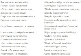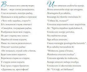 Сведения о переводчике: Манирагена Валенс – родом из Руанды, проживает в России с 1994 года. Преподает в СПбГЭТУ «ЛЭТИ» и СПбГУ. Увлекается переводческой деятельностью с французского и рус- ского языков на киньяруанда, а также с киньяруанда на русский язык. На его счету перевод на киньяруанда книг Антуана де Сент-Экзюпери «Маленький принц» и «Военный летчик», переводы стихов А. С. Пушкина, М. Ю. Лермонтова, Анны Ахматовой. Иллюстрации – Ндахайо Мирей, студентка I курса Государственного университета морского и речного флота имени адмирала С.О. Макарова.